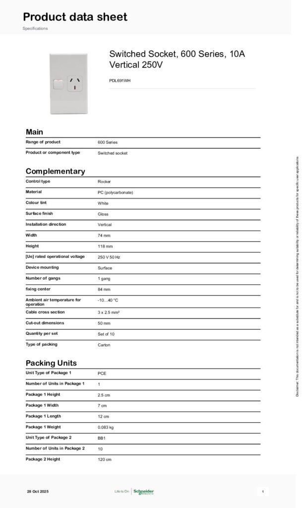 PDL 600 SERIES SINGLE VERTICAL SWITCHEDSOCKET OUTLET – 10A, WHITE