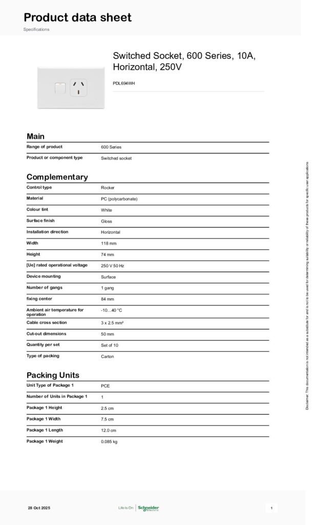 PDL 600 SERIES SINGLE HORIZONTAL SWITCHED SOCKET OUTLET – 10A, WHITE